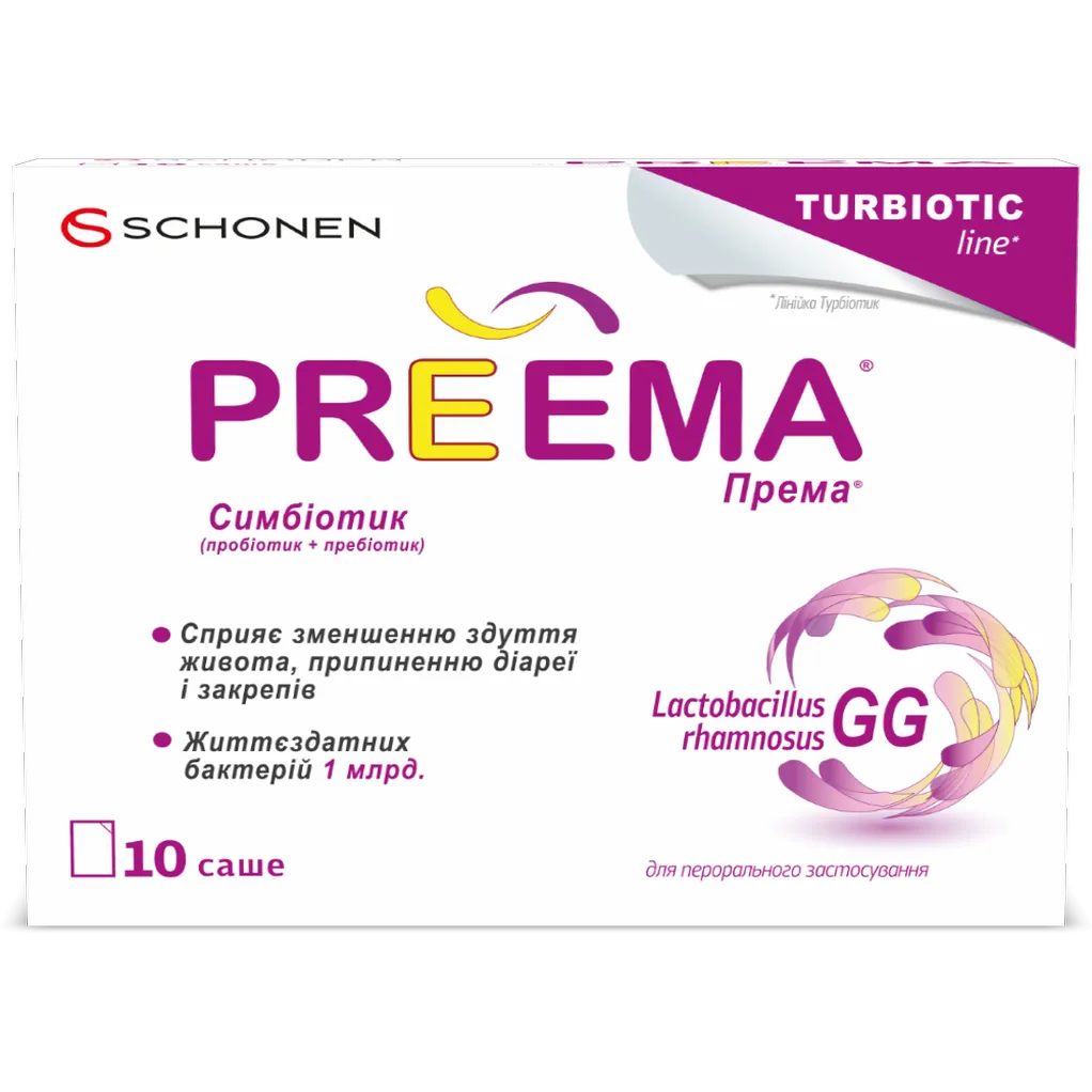 Симбіотик – це спеціальний комплекс, що містить Lactobacillus rhamnosus GG та харчові пребіотичні волокна (фруктоолігосахариди). Према в саше сприяє усуненню та профілактиці дисбактеріозу, закрепів у дорослих і дітей, нормалізації мікрофлори кишківника.